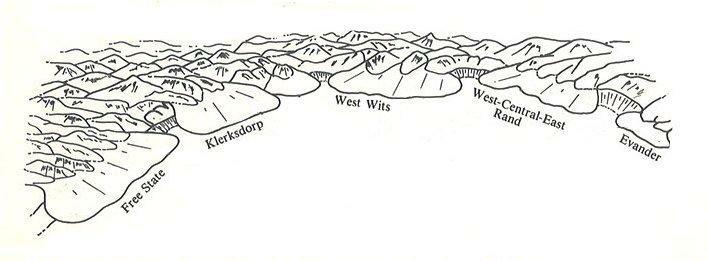 bottom right is the area of smashed granite - schistoid rock. In one place on the Koppies you can see where the lowest level of the Orange Grove Quartzite lies upon the granitoid basement. This is the "unconformity". The basement rocks are far older than the quartzite - by about four hundred million years - and whatever geological processes happened in that length of time - presumably a long period of erosion - are irretrievably lost. The place where the two rock types meet shows that a period of violent tectonic action took place at some later time, thrusting the sedimentary rock against the basement, shattering the granite. The result is a layer, about 10cm wide, of crushed granite, technically called schist. This phenomenon is only to be seen at two other sites in Johannesburg: others are unknown, lost below buildings. Another feature of the Koppies is the abundance of quartz veins. Quartz was formed in the deep crust by hydrothermal action - the violent explosion of liquid trapped in deep layers, under conditions of great heat and pressure, leaching silicon dioxide from the silica rich quartzite. The veins vary from tiny seams only millimetres thick, to layers nearly a meter wide. Tectonic forces over the millions of years have largely shattered the quartz veins, meaning that the Koppies are covered with small milky white pebbles. Finally, there is a completely different formation in the stream bed. Here, in the fault through which Beyers Naude Drive now runs, there is an intrusion of igneous rock - Gabbro or Dolerite (the difference is one of grain size, not chemical composition) which thrust up into the crust and cooled far below the surface about two billion years ago. It is probably associated with the huge volcanic activity which created the Bushveld Igneous Complex. Thus the Melville Koppies represents in microcosm most of the features of the Witwatersrand Supergroup. What it does not have is gold-bearing rock. This occurs millions of years, and several kilometres, higher up in the sequence. The early owners, the Geldenhuys family, discovered this, to their regret. Sources: Norman N and Whitfield G, 2006 Geological Journeys,