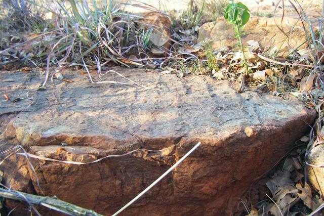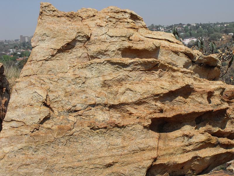 West. The North to South tilt of the ridges can be seen clearly. A key to understanding the shape of these deposits today is that through tectonic action they no longer take the form of sprawling horizontal beds, but, as layers of rock, have been tipped southwards at a steep angle. They jut out of the present surface as long ridges, and plunge below the surface at an angle of about 70° to the horizontal. A dramatic view of this tipping effect can be seen when you drive in from OR Tambo airport, and first see the Linksfield Ridge. This tipping action was probably caused by the weight of water to the south, which caused the basin to sag and drag the edges downwards, as well as some other possible factors like the outpouring of the Ventersdorp lavas about 2.7 billion years ago (an event which ended the period of deposition), and the Vredefort asteroid impact. The Melville Koppies Nature Reserve lies astride the geological "unconformity" - the place where the sediments of the Witwatersrand Supergroup lie upon the basement rocks. Thus the northern slopes have a thick reddish topsoil, the result of the decomposition of the mineral-rich granodiorite basement, while the ridges and southern part of the reserve consist of the quartzites and shales of the Supergroup. These rocks decompose to a thin, acidic soil, and this is reflected by the sparse grasses, proteas and other hardy shrubs which grow there. In the quartzite there are many signs of its sedimentary origin - ripple marked rocks and cross bedding. Ripple marks probably reflect the marks of the "last wave up the beach" which were then preserved by a sudden event like a fall of fine volcanic ash, or the dust of a sandstorm. This thin layer, later lost through erosion, nevertheless created a plane of weakness where the rock would later break, revealing the original marks in the sand. Cross bedding is evidence of a long period of stable sedimentation followed by a violent event like a flash flood or a tsunami which caused large quantities of sediment to pour over the stable bed and settle at a different angle. In the picture on the right the (approximately) horizontal layers of the stable bed can be seen, while the cross layers go from top left to bottom right. The shale and siltstone layers within the quartzite are softer, erode more easily, and form the shallow valleys between the quartzite ridges. ![]() The "unconformity". At the top right the