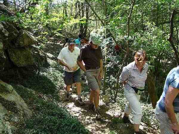 In spring the new leaves of the Ficus Ingens come out in a bold display of red. Here walkers pass below the cliff where the cave is. The tree with the cream flowers is the Wild Pear (Dombeya rotundifolia). Photo: Wendy Carstens At its foot is a small cave in which Late Stone Age artefacts were found, together with bones of game hunted and killed by the people who used it. Above the cave and along the cliff grows a very old Ficus ingens known sometimes as the Red-leaved fig, the rock-breaker, or in Afrikaans the Rotsbreker